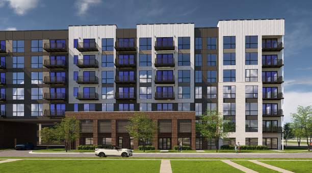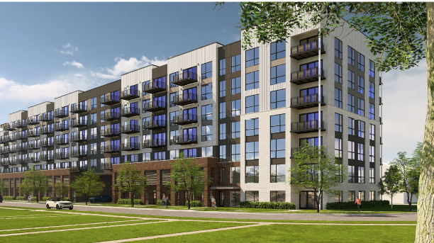 Woodbury Gardens proposes to rezone their existing development from various R4 districts (Multiple Family) to TC1 (Transit Corridor), with conditions capping the building height. One parcel would be redeveloped with two seven-story buildings containing 357 dwelling units, and a five level parking garage.