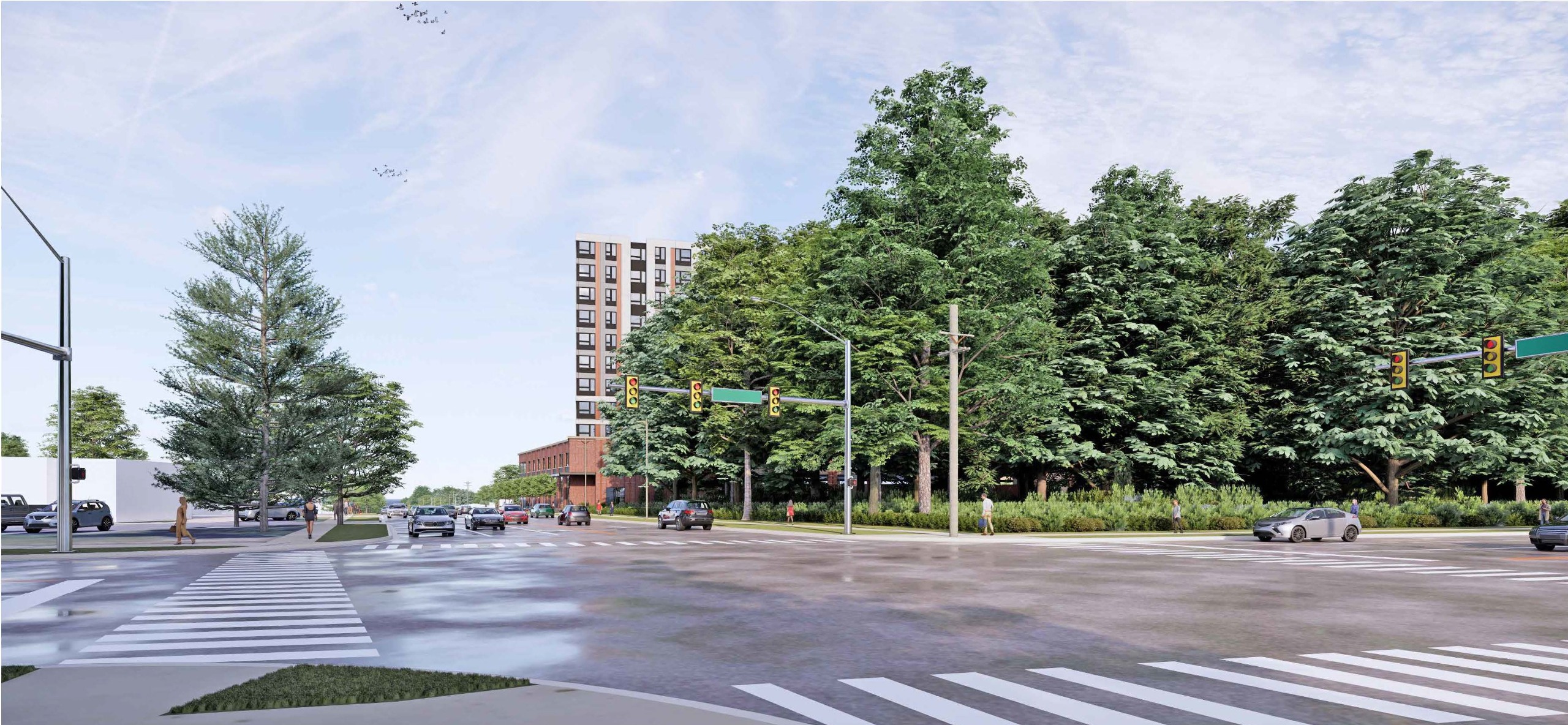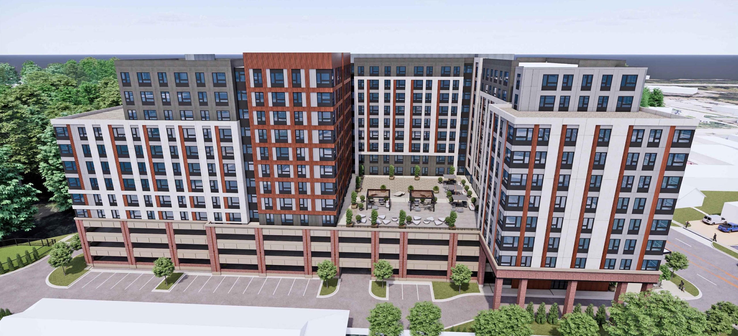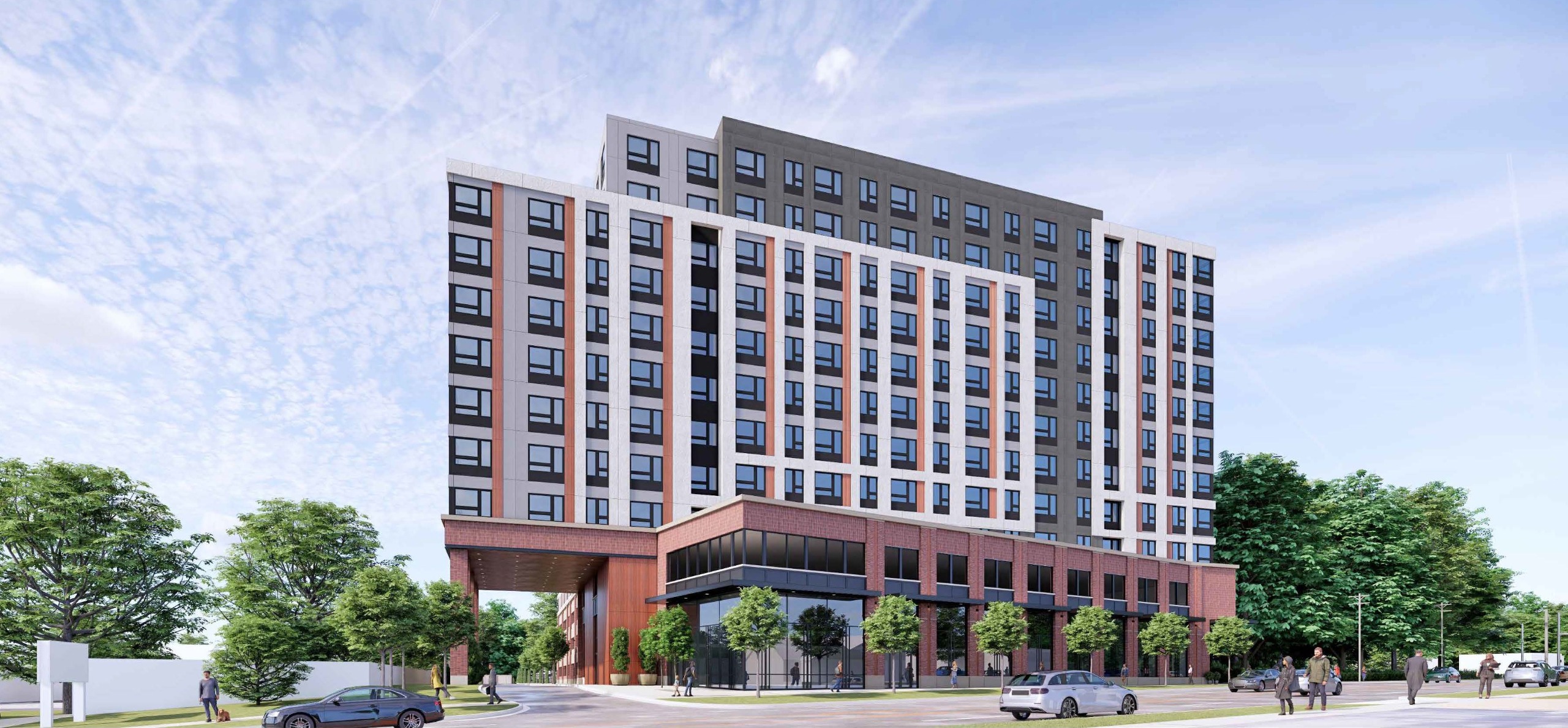 The existing building would be demolished. Amenities for the development will include shifting the bus stop to provide additional shelter during inclement weather, a fitness area, an indoor kids area, a playground, a pool, and other amenities.