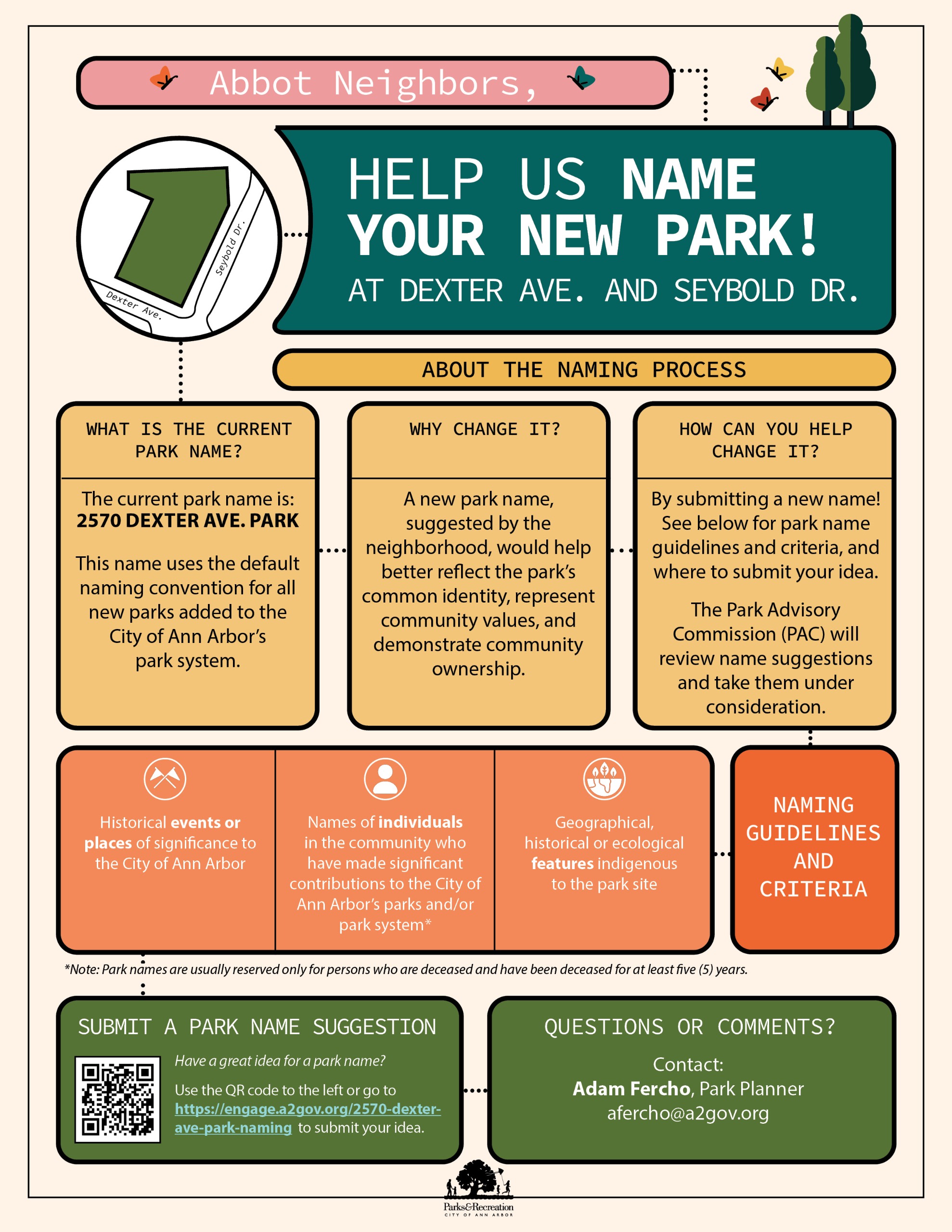 The current park name is 2570 Dexter Ave. Park, a generic name based on the default naming convention for all new parks added to the City of Ann Arbor park system. We are asking community members to submit name suggestions, which will be reviewed and considered by the Park Advisory Commission (PAC). A new park name, suggested by the neighborhood, would help better reflect the park’s common identity, represent community values, and demonstrate community ownership.
