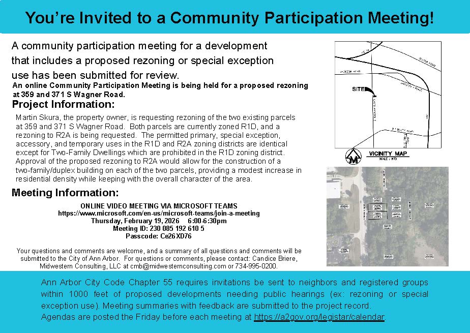 This is considered a Type 1 development. A postcard was mailed to all properties within 1,000 feet of 359 and 371 S. Wagner. Call in information is below.