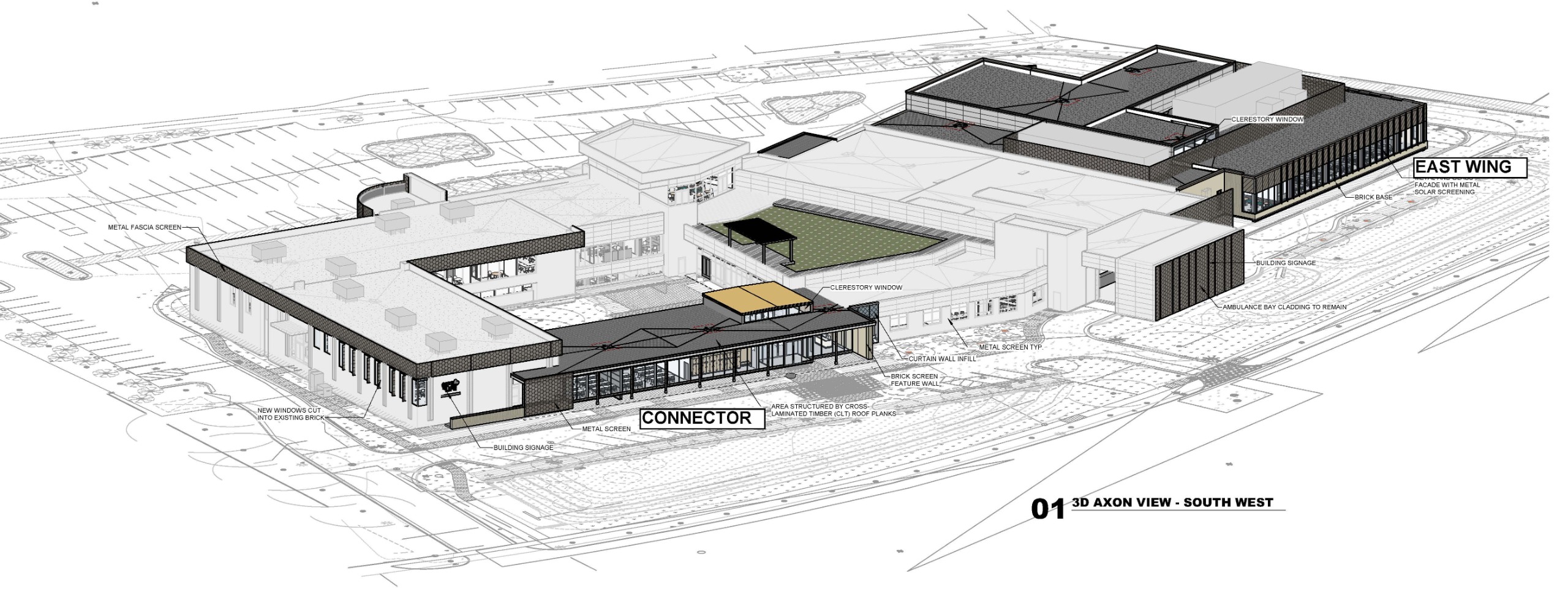 - The original eastern building will be fully demolished and replaced with a new one-story east wing containing laboratory and medical