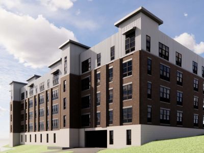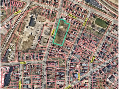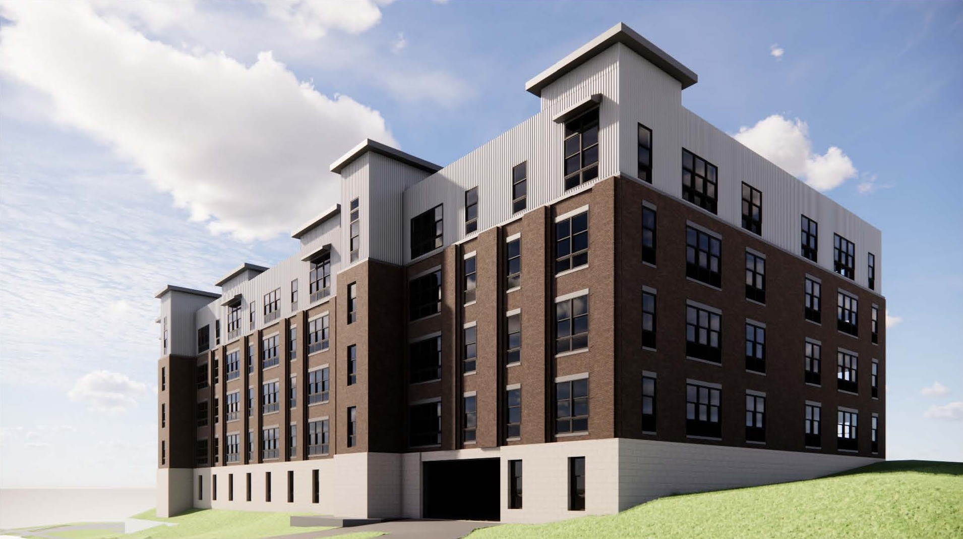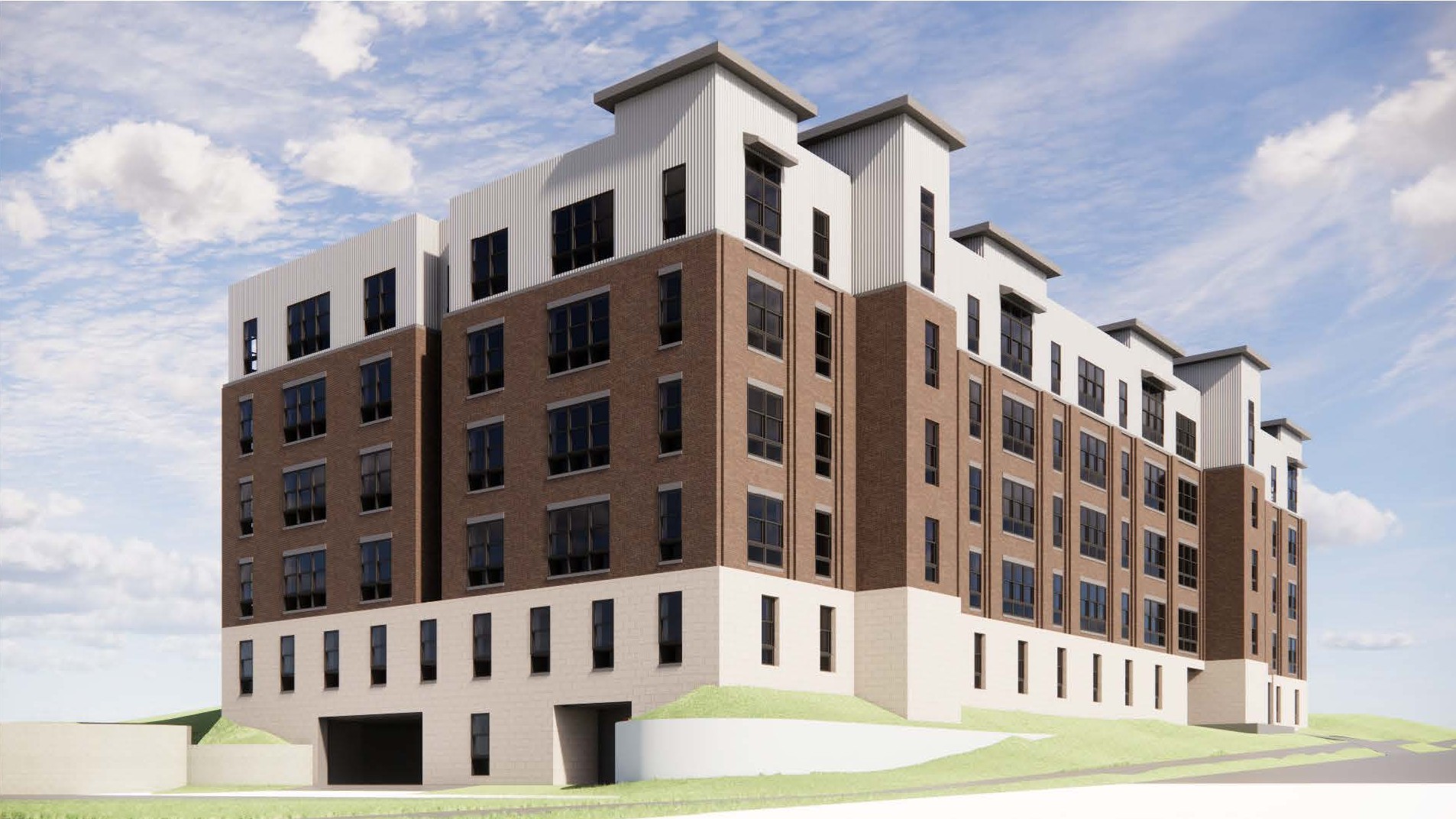 An application was submitted to rezone a 52,000-square foot parcel from R4C (Multi-Family Dwelling) to C2B (Business Service Commercial) to develop a 6-story residential building. The building has two floors of parking with about 84 proposed parking spaces and four stories of residential use, with 64 dwelling units.