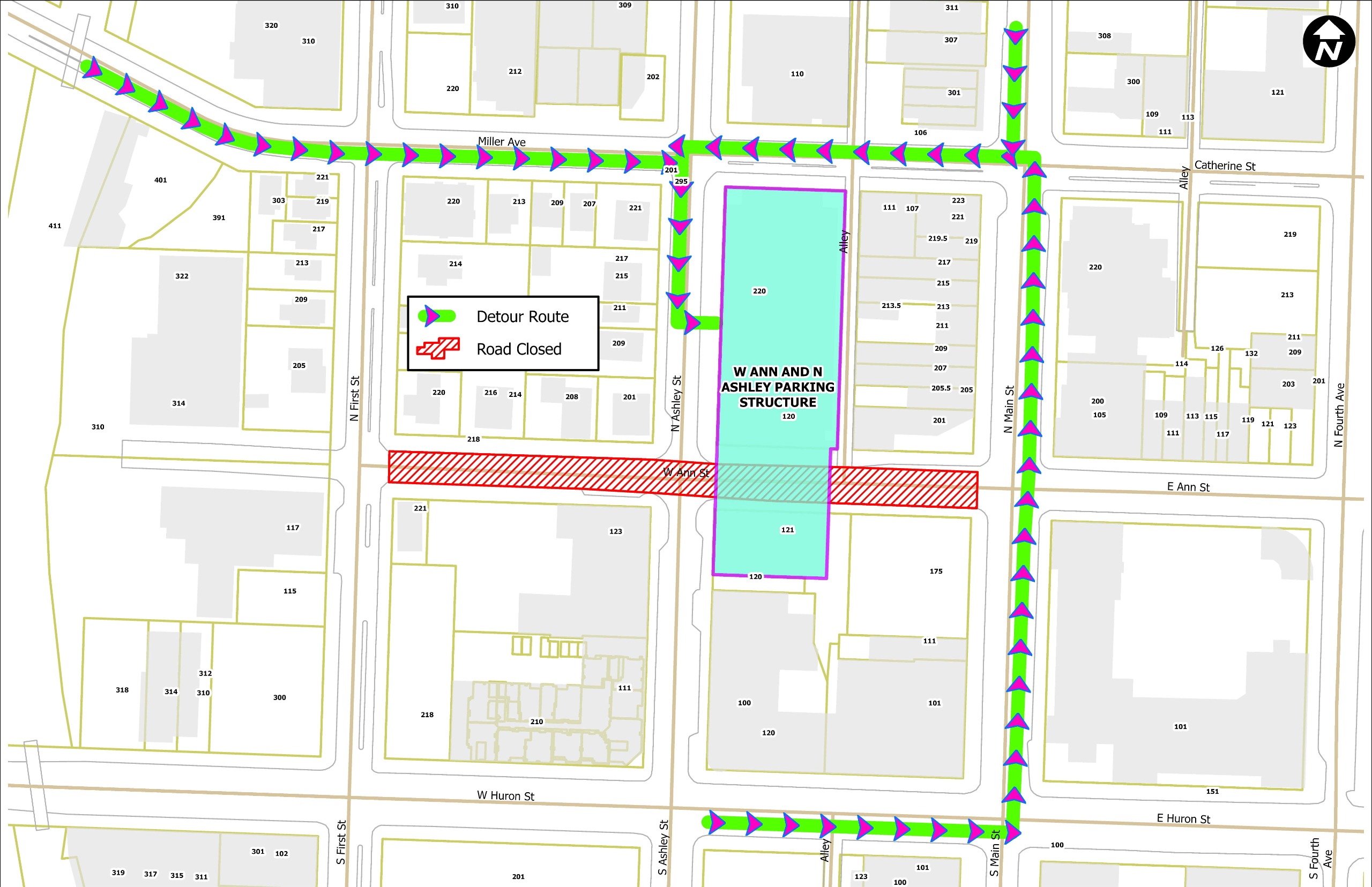 - Access to the Ann Ashley parking structure must be made from Miller Avenue to North Ashley Street.
