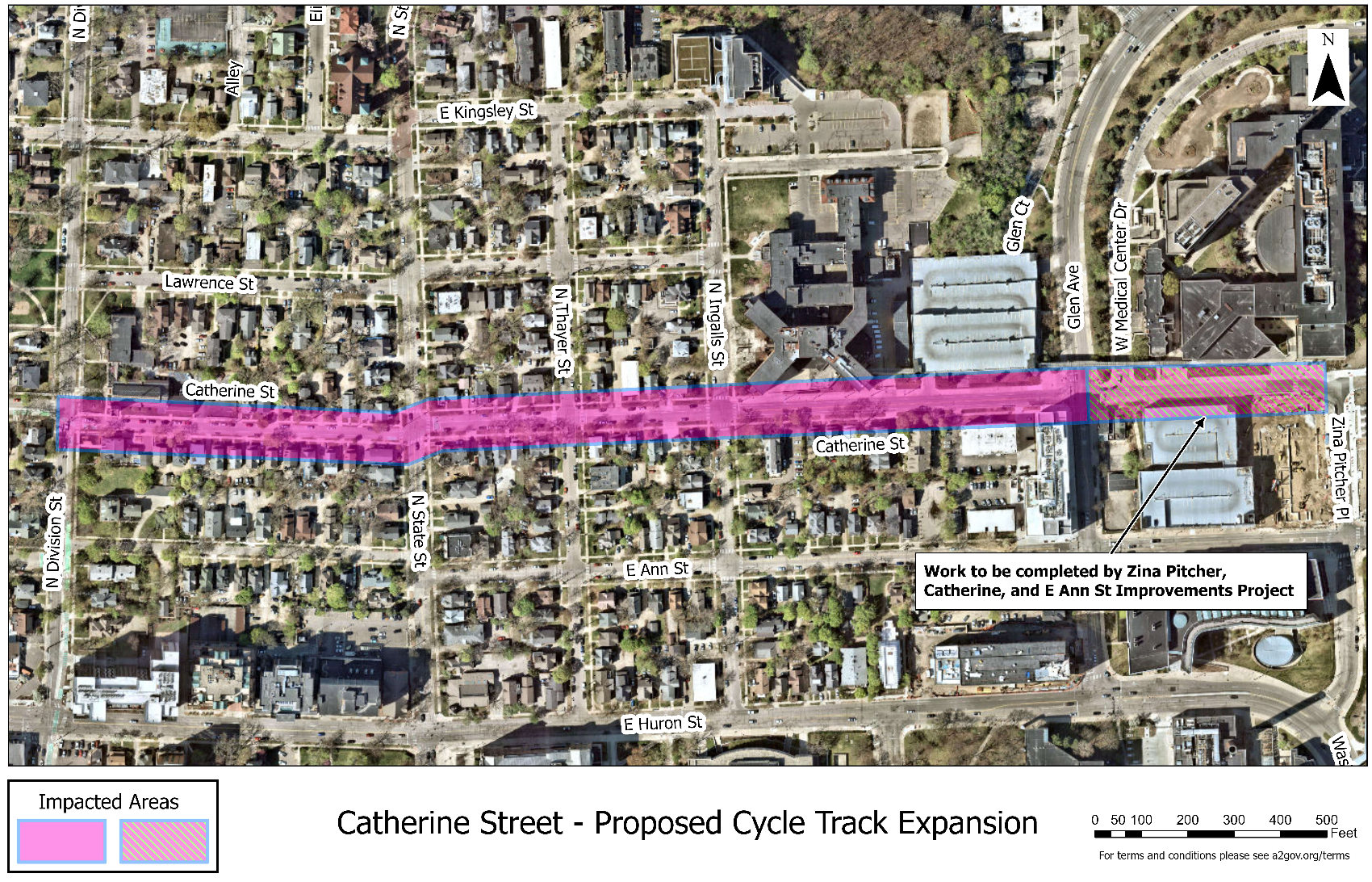 The project will extend a safe, accessible, All Ages and Abilities 2-way bicycle route on Catherine Street, while also supporting pedestrian safety with bumpouts, signal phasing and other improvements at intersections within the project area. The project will also connect to a 2026 road resurfacing project extending the bicycle facility through the Glen/Catherine intersection to Zina Pitcher. When paired with the recently completed Miller Avenue project , the future cycletrack will serve as an east-west bicycle trunkline connecting residential neighborhoods, downtown and one of the City’s major employment centers.