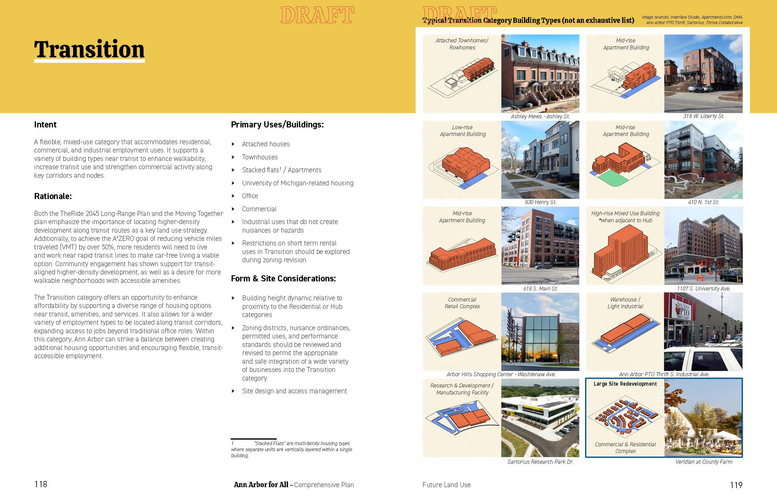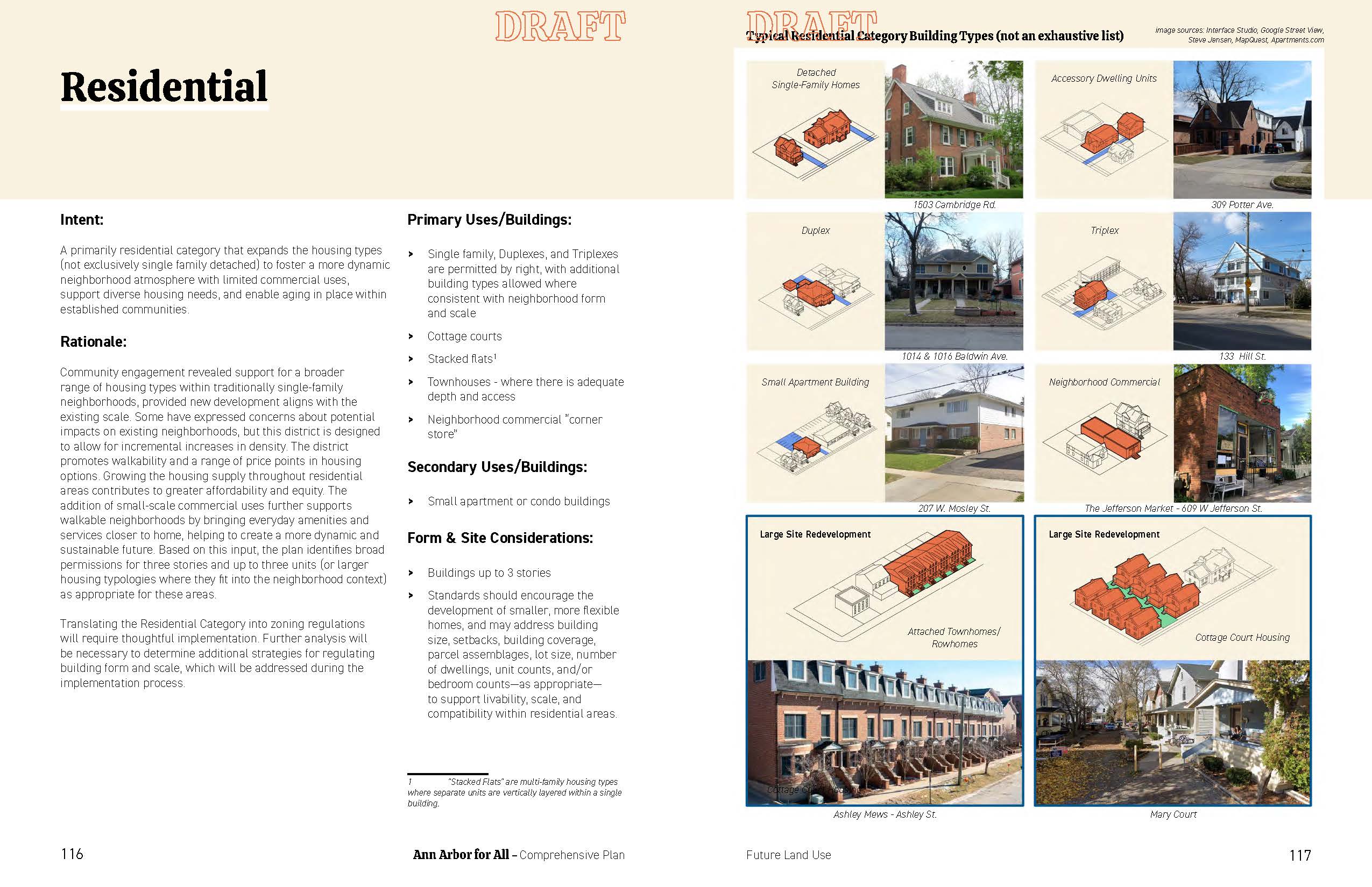At a later date, 48 feet (4 stories) was suggested for the residential district to help to increase housing supply and align with building code. This has caused many residents to write in and attend public comment in opposition to an additional story for fear of being out of scale with the surrounding housing types. As such, City Council has passed a resolution that has asked for the Comprehensive Land Use Plan to limit heights to 3 stories and suggested other ways to regulate housing so that they maintain a good fit in existing neighborhoods. The draft plan was created prior to this recent action by the City Council. Planning staff anticipates height limits will be addressed during the first edits currently being considered.