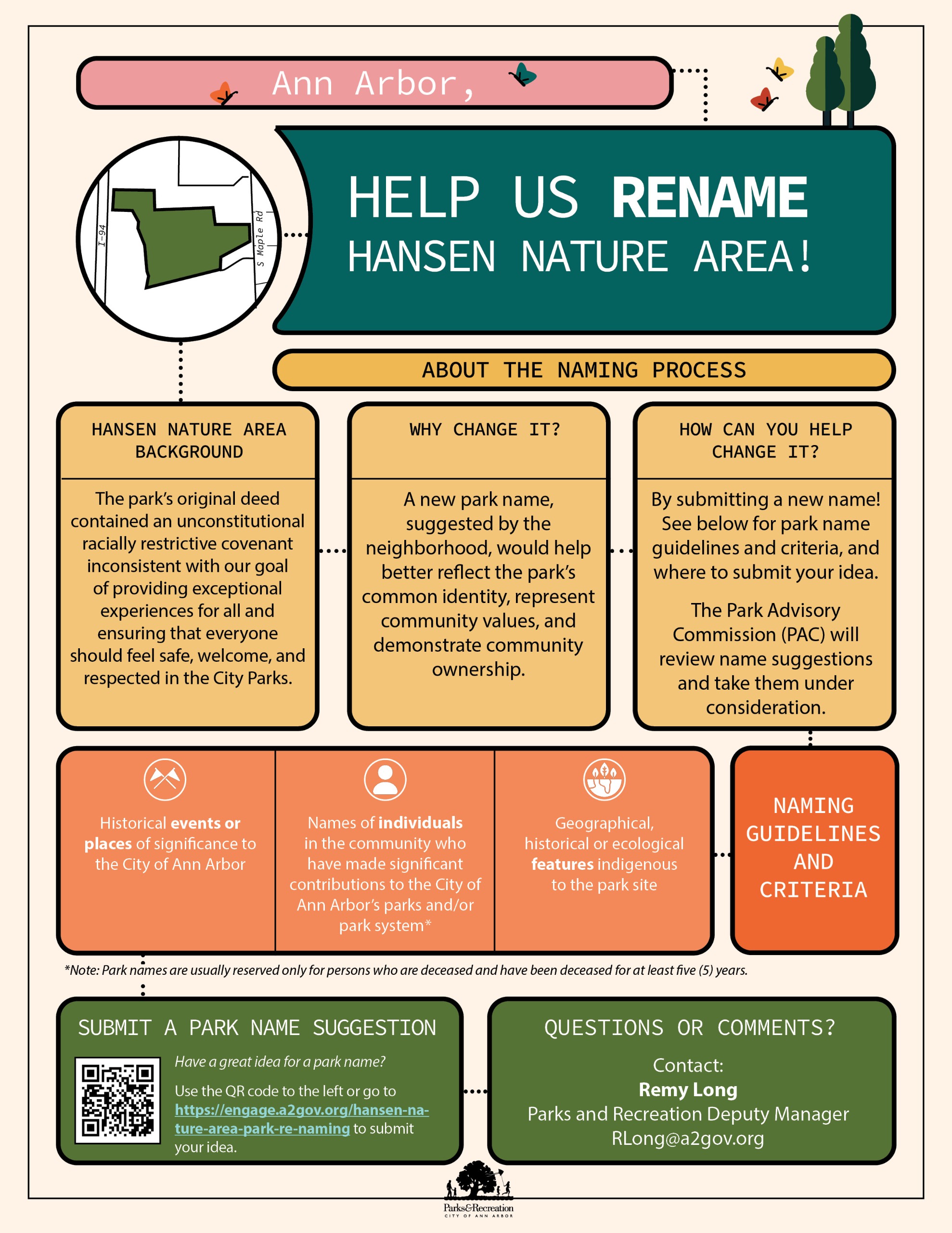 The original Hansen Nature Area deed contained an unconstitutional racially restrictive covenant inconsistent with Parks and Recreation Services' goal of providing exceptional experiences for all and ensuring that everyone should feel safe, welcome, and respected in the City Parks. Therefore, the restrictions were officially removed from the deed in 2025, and a new name is now being chosen. We are asking community members to submit name suggestions, which will be reviewed and considered by the Park Advisory Commission (PAC).