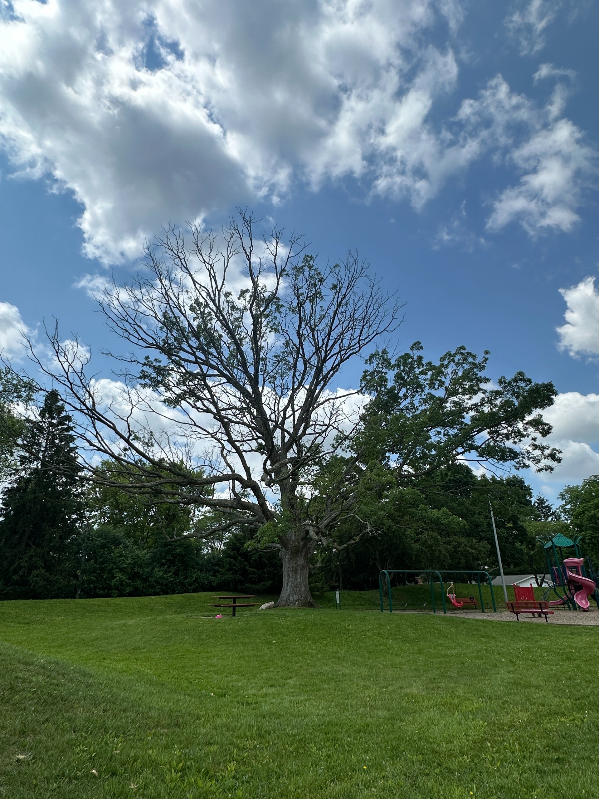 The large oak tree in Mushroom Park was removed due to decline and safety concerns. The tree will be reused on site to create a nature play area, similar to the Great Oak Nature Playground near Barton Dam.
