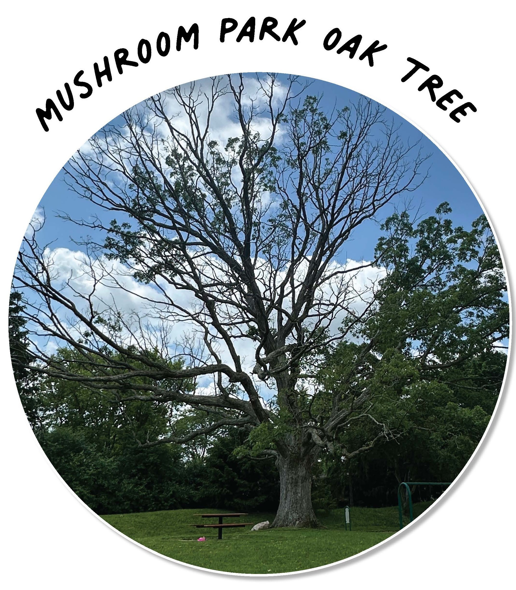 The large oak tree in Mushroom Park must be removed due to decline and safety concerns. The tree will be reused on site to create a nature play area, similar to the Great Oak Nature Playground near Barton Dam (pictured below).